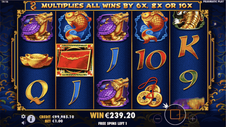 ห่อหุ้ม – คุณสามารถเล่นเกมโบนัสที่ทำกำไรได้ค่อนข้างมากโดยใช้ไอคอนนี้ เมื่อคุณตีซองจดหมาย 3 อันได้ทุกที่ คุณจะเห็นหน้าจอพร้อมมังกร 5 ตัว 4 มาพร้อมกับจำนวนฟรีสปินคงที่และตัวคูณที่หลากหลาย อันที่ 5 จะให้จำนวนการหมุนแบบสุ่มและชุดตัวคูณแบบสุ่ม ตัวคูณจากช่วงที่เลือกจะถูกนำไปใช้กับการชนะหากมังกรประกอบด้วยแถวที่ชนะในมุมมองทั้งหมดระหว่างเกมโบนัส